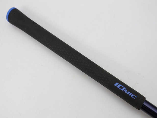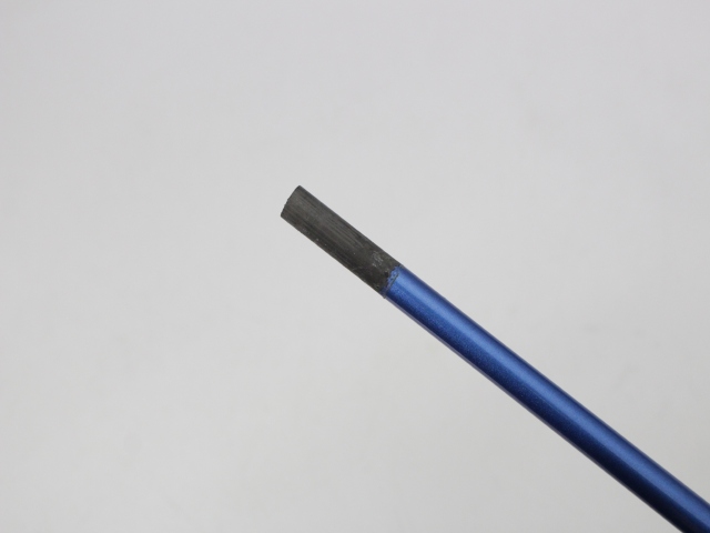 シャフト全長44インチ(先端からグリップエンドまで)、実測総重量119g、先端塗装剥離約30mm。グリップはイオミック スティッキーエボリューション1.8 ブラック/ブルーエンド バックラインなしで、特に擦り減りはありません。シャフトの状態は薄い傷が少々あるぐらいでキレイです。こちらは先端ノーカット、シャフト伸ばしはありません。シャフトロゴとグリップロゴは同じ向きです。先端の穴は接着剤が残っています。