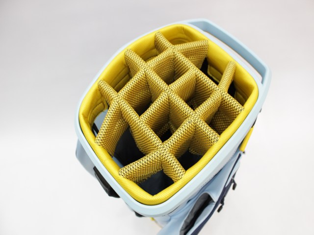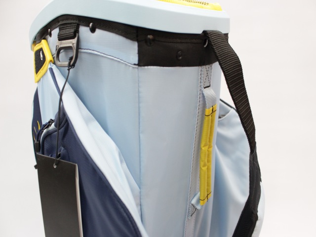 日本未発売USモデル!14分割(各差し口が底まできちんとセパレートされています)、実測口径約10インチ、重量約2.9kg、フード付です(ナイロンタイプの黒色です)。ネームプレートはありません。フロント上部ポケットの下にカートのベルトを通す隙間がありますので、日本のカートにも問題なく搭載できます。ラウンド中は前面ポケットが多く非常に便利です!