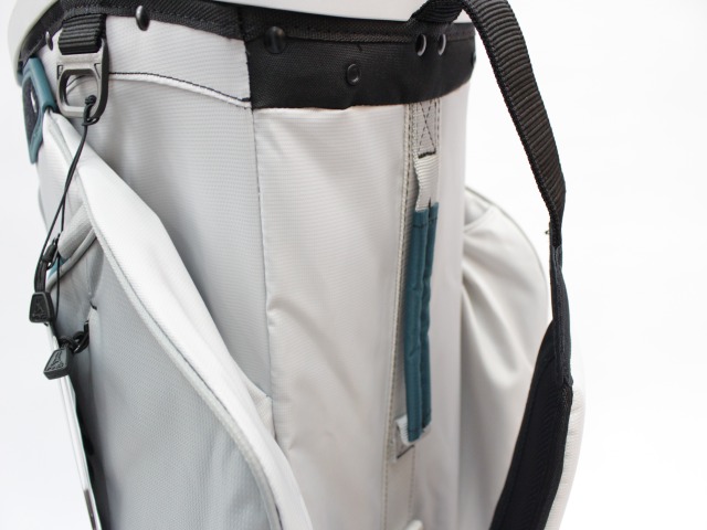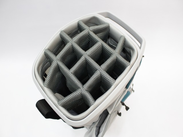 日本未発売USモデル!14分割(各差し口が底まできちんとセパレートされています)、実測口径約10インチ、重量約2.9kg、フード付です(ナイロンタイプの黒色です)。ネームプレートはありません。フロント上部ポケットの下にカートのベルトを通す隙間がありますので、日本のカートにも問題なく搭載できます。ラウンド中は前面ポケットが多く非常に便利です!