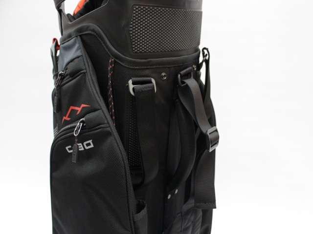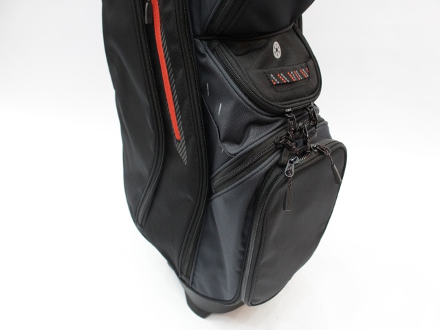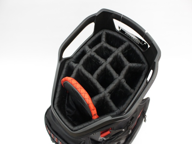 実測縦口径約11インチ(メーカー公表は9インチ[実測横幅])、約3.6kg、14分割、各差し口は底まできちんと分割されています。シングルストラップ。フード付(本体ブラックカラー)。ネームプレートはありません。日本のキャディバッグとは取っ手の位置が反対ですが、フロント上部のポケットの下はカートのベルトが通るようになっています。
