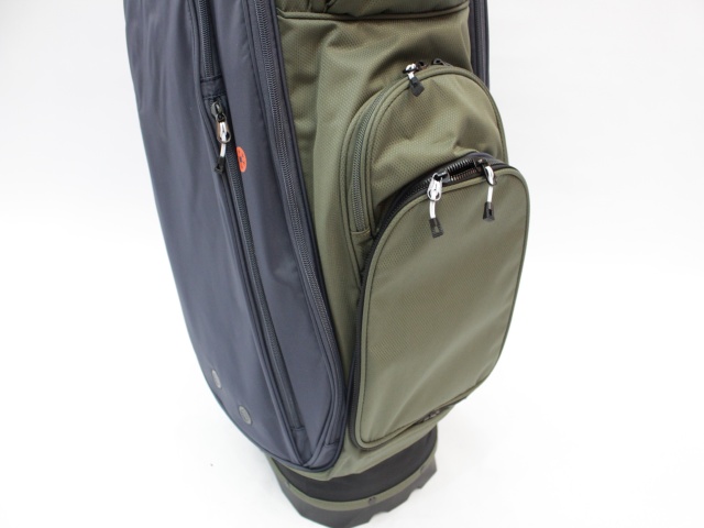 実測縦口径約10インチ、約2.9kg、14分割、各差し口は底まできちんと分割されています。シングルストラップ。フード付(本体ブラックカラー)。ネームプレートはありません。日本のキャディバッグとは取っ手の位置が反対ですが、フロント上部のポケットの下はカートのベルトが通るようになっています。