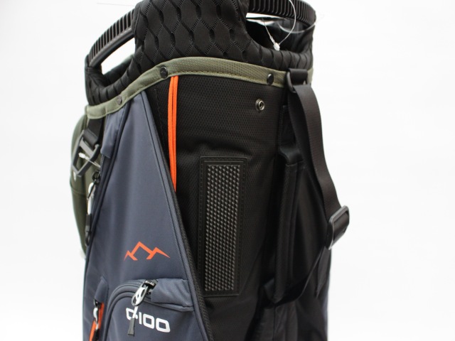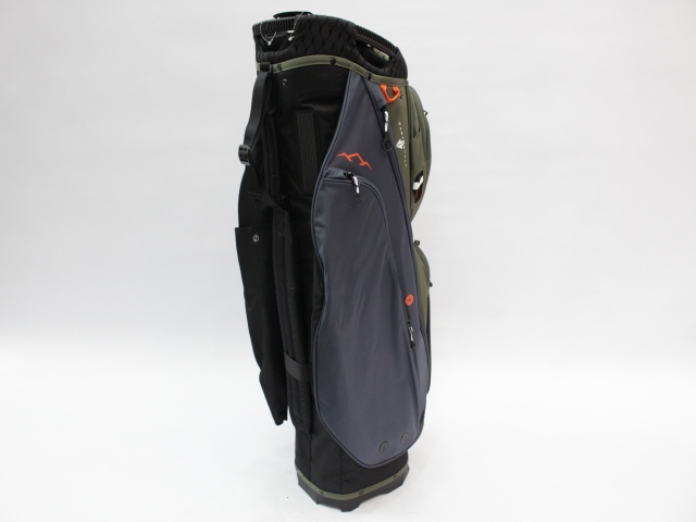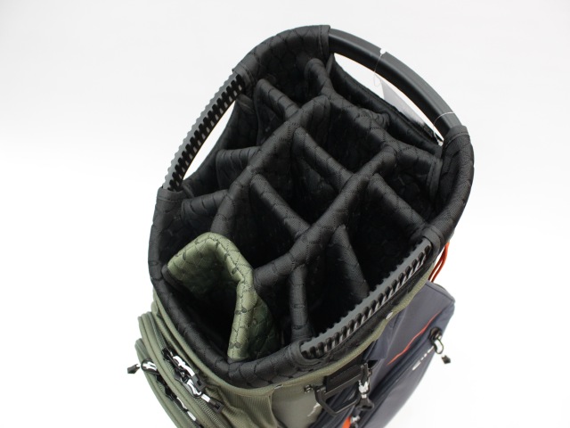 実測縦口径約10インチ、約2.9kg、14分割、各差し口は底まできちんと分割されています。シングルストラップ。フード付(本体ブラックカラー)。ネームプレートはありません。日本のキャディバッグとは取っ手の位置が反対ですが、フロント上部のポケットの下はカートのベルトが通るようになっています。