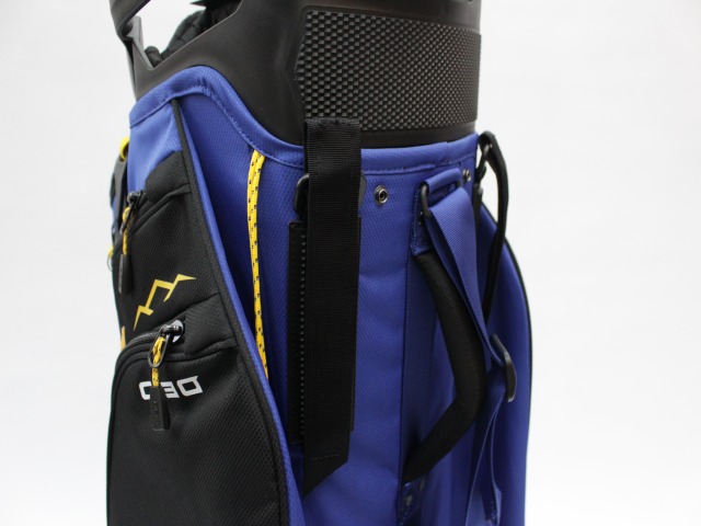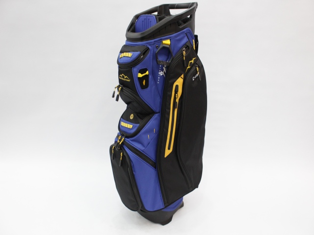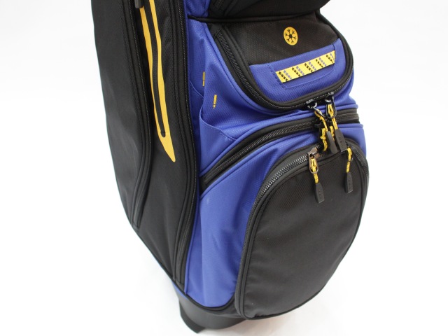 実測縦口径約11インチ(メーカー公表は9インチ[実測横幅])、約3.6kg、14分割、各差し口は底まできちんと分割されています。シングルストラップ。フード付(本体とブルーカラー)。ネームプレートはありません。日本のキャディバッグとは取っ手の位置が反対ですが、フロント上部のポケットの下はカートのベルトが通るようになっています。