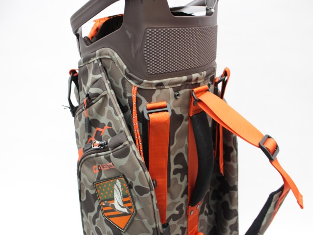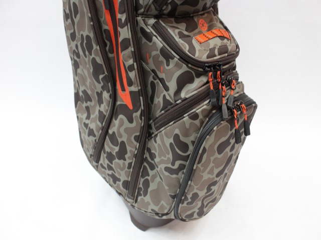 実測縦口径約11インチ(メーカー公表は9インチ[実測横幅])、約3.6kg、14分割、各差し口は底まできちんと分割されています。シングルストラップ。フード付(本体と同じ迷彩柄)。ネームプレートはありません。日本のキャディバッグとは取っ手の位置が反対ですが、フロント上部のポケットの下はカートのベルトが通るようになっています。