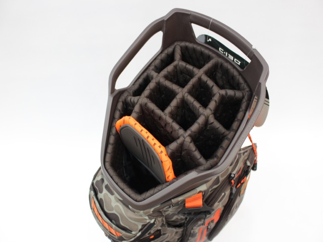 実測縦口径約11インチ(メーカー公表は9インチ[実測横幅])、約3.6kg、14分割、各差し口は底まできちんと分割されています。シングルストラップ。フード付(本体と同じ迷彩柄)。ネームプレートはありません。日本のキャディバッグとは取っ手の位置が反対ですが、フロント上部のポケットの下はカートのベルトが通るようになっています。