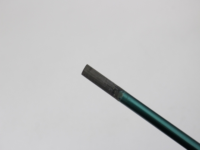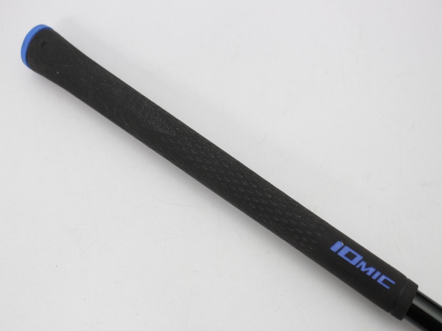 シャフト全長43.75インチ(先端からグリップエンドまで)、実測総重量98g、先端塗装剥離約33mm。グリップはイオミック スティッキーエボリューション1.8 ブラック/ブルーエンド バックラインなしで、使用感はありますが特に目立つような擦り減りはありません。シャフトの状態は薄い傷が少々あるぐらいでキレイです。こちらは先端ノーカット、シャフト伸ばしはありません。シャフトロゴとグリップロゴは同じ向きです。先端の穴は接着剤が残っています。