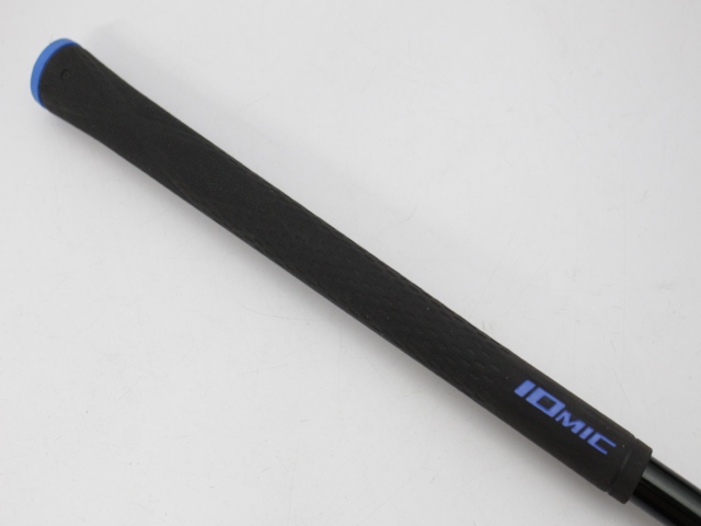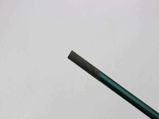 シャフト全長44インチ(先端からグリップエンドまで)、実測総重量112g、先端塗装剥離約34mm。グリップはイオミック スティッキーエボリューション1.8 ブラック/ブルーエンド バックラインなしで、使用感はありますが特に目立つような擦り減りはありません。シャフトの状態は少々の傷があるぐらいでキレイです。こちらは先端ノーカット、シャフト伸ばしはありません。シャフトロゴとグリップロゴは同じ向きです。先端の穴は接着剤が残っています。